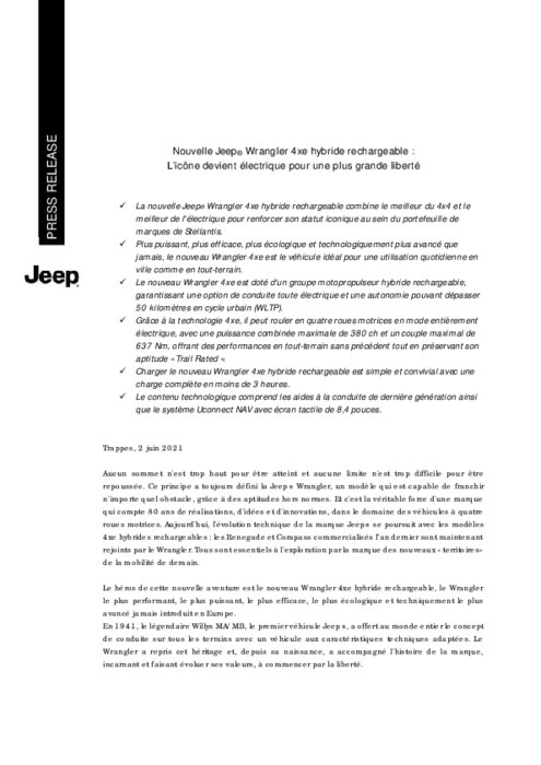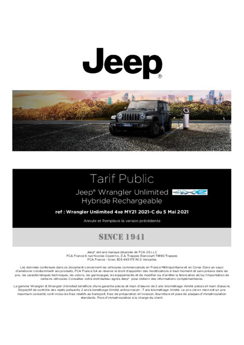 La nouvelle Jeep Wrangler 4xe hybride rechargeable combine le meilleur du 4x4 et le meilleur de l'électrique pour renforcer son statut iconique au sein du portefeuille de marques de Stellantis. Plus puissant, plus efficace, plus écologique et technologiquement plus avancé que jamais, le nouveau Wrangler 4xe est le véhicule idéal pour une utilisation quotidienne en ville comme en tout-terrain. Le nouveau Wrangler 4xe est doté d'un groupe motopropulseur hybride rechargeable...