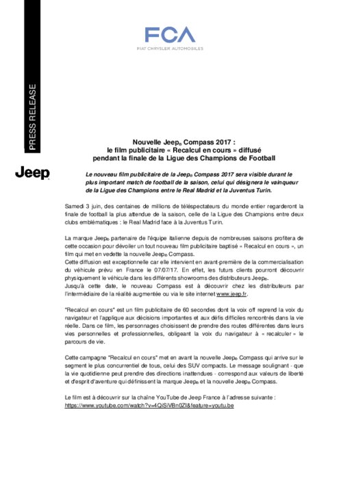 Constructeurs 02 juin 2017 - 18:40 Le nouveau film publicitaire de la Jeep®Compass 2017 sera visible durant le plus important match de football de la saison, celui qui désignera le vainqueur de la Ligue des Champions entre le Real Madrid et la Juventus Turin. PDF (156 Ko) Télécharger
