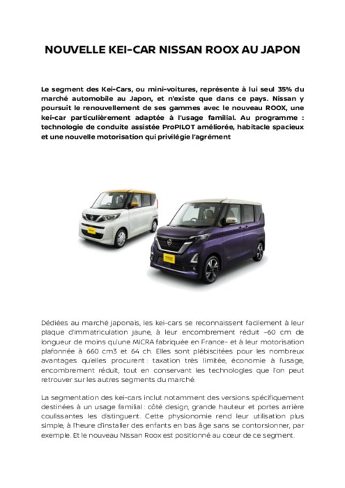 Le segment des Kei-Cars, ou mini-voitures, représente à lui seul 35% du marché automobile au Japon, et n'existe que dans ce pays. Nissan y poursuit le renouvellement de ses gammes avec le nouveau ROOX, une kei-car particulièrement adaptée à l'usage familial. Au programme : technologie de conduite assistée ProPILOT améliorée, habitacle spacieux et une nouvelle motorisation qui privilégie l'agrément...