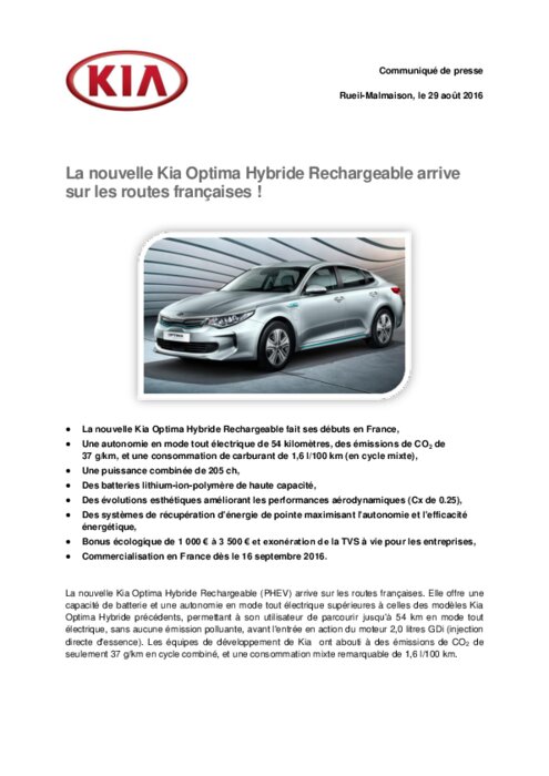 La nouvelle Kia Optima Hybride Rechargeable (PHEV) arrive sur les routes françaises. Elle offre une capacité de batterie et une autonomie en mode tout électrique supérieures à celles des modèles Kia Optima Hybride précédents, permettant à son utilisateur de parcourir jusqu’à 54 km en mode tout électrique, sans aucune émission polluante, avant l'entrée en action du moteur 2,0 litres GDi (injection directe d'essence).