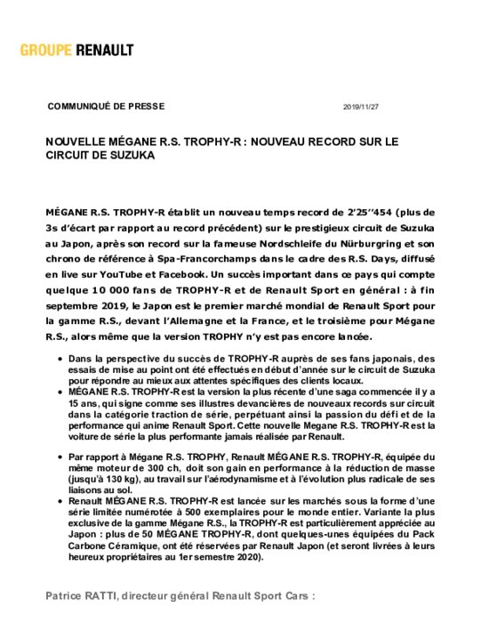 MÉGANE R.S. TROPHY-R établit un nouveau temps record de 2’25’’454 (plus de 3s d’écart par rapport au record précédent) sur le prestigieux circuit de Suzuka au Japon, après son record sur la fameuse Nordschleife du Nürburgring et son chrono de référence à Spa-Francorchamps dans le cadre des R.S. Days, diffusé en live sur YouTube et Facebook. Un succès important dans ce pays qui compte quelque 10 000 fans de TROPHY-R et de Renault Sport en général...