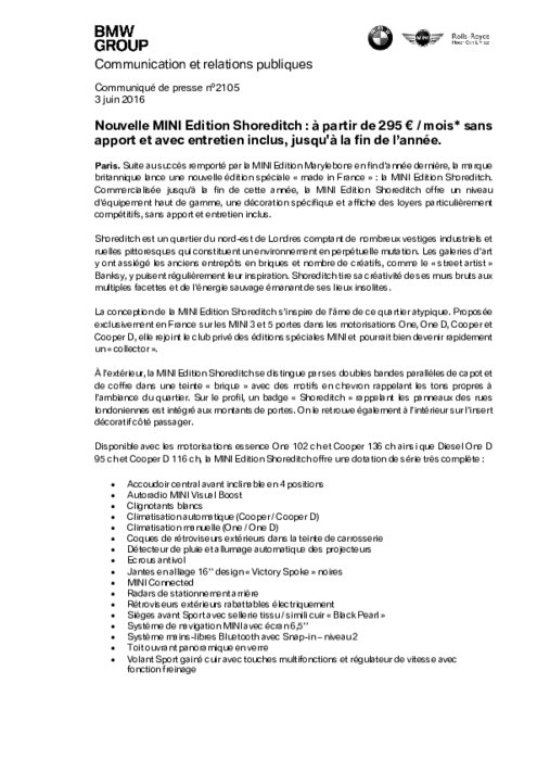 Suite au succès remporté par la MINI Edition Marylebone en fin d’année dernière, la marque britannique lance une nouvelle édition spéciale « made in France » : la MINI Edition Shoreditch. Commercialisée jusqu’à la fin de cette année, la MINI Edition Shoreditch offre un niveau d’équipement haut de gamme, une décoration spécifique et affiche des loyers particulièrement compétitifs, sans apport et entretien inclus.