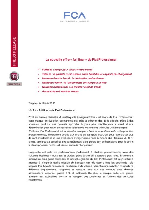 2016 est l’année charnière durant laquelle émergera l’offre "full liner" de Fiat Professional : cette marque en évolution permanente est prête à affronter des défis décisifs grâce à des nouveaux produits, une nouvelle approche toujours plus orientée vers le client et une détermination pour ouvrir de nouvelles voies sur le marché des véhicules utilitaires légers. D’ailleurs, Fiat Professional est la première marque "born to be professional" (née pour être professionnel).
