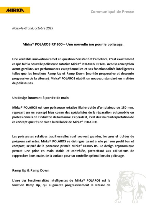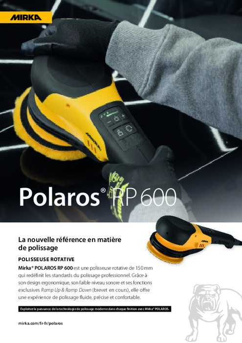Une véritable innovation remet en question l’existant et l’améliore. C’est exactement ce que fait la nouvelle polisseuse rotative Mirka POLAROS RP 600. Avec sa conception avant-gardiste, ses performances exceptionnelles et ses fonctionnalités intelligentes telles que les fonctions Ramp Up et Ramp Down (montée progressive et descente progressive de la vitesse), Mirka POLAROS établit un nouveau standard en matière de polisseuses.