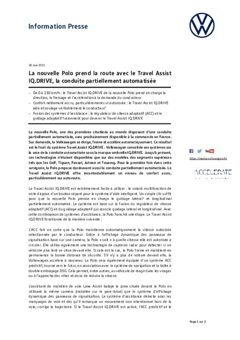 La nouvelle Polo, une des premières citadines au monde disposant d’une conduite partiellement automatisée, sera prochainement disponible à la commande en France. Sur demande, la Volkswagen se dirige, freine et accélère automatiquement. Ce résultat est le fruit du système Travel Assist IQ.DRIVE . Volkswagen consolide ses systèmes sur la voie de la conduite automatisée sous la marque ombrelle IQ.DRIVE...