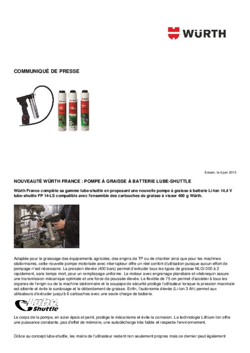 Adaptée pour le graissage des équipements agricoles, des engins de TP ou de chantier ainsi que pour les machines stationnaires, cette nouvelle pompe motorisée avec interrupteur offre un réel confort d'utilisation puisque aucun effort de pompage n'est nécessaire. La pression élevée (400 bars) permet d'extruder tous les types de graisse NLGI 000 à 2 rapidement, sans temps mort, pour un remplissage uniforme.