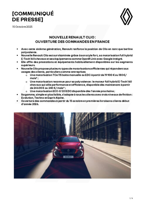 Nouvelle Clio s’intègre dans l’offre Renault riche et complémentaire sur le segment B. Sont ainsi proposés, deux modèles E-Tech electric : Renault 5 (3,92 m) et Renault 4 (4,14 m) et deux modèles full hybrid E-Tech : nouvelle Clio (4,12 m) et Captur (4,24 m). A noter, Twingo E-Tech electric prévue l’an prochain sera l’offre d’entrée de gamme de la marque sur le segment A.