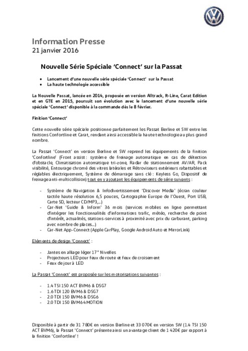 Constructeurs 21 janvier 2016 - 18:00 La Nouvelle Passat, lancée en 2014, proposée en version Alltrack, R-Line, Carat Edition et en GTE en 2015, poursuit son évolution avec le lancement d’une nouvelle série spéciale ‘Connect’ disponible à la commande dès le 8 février. PDF (75 Ko) Télécharger