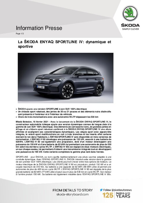 Avec le lancement de la ŠKODA ENYAQ SPORTLINE iV, le constructeur automobile tchèque ajoute une version dynamique connue de longue date à la gamme de son SUV 100% électrique. Des éléments de carrosserie noirs, de grandes jantes en alliage et un châssis sport rabaissé confèrent à la ŠKODA ENYAQ SPORTLINE iV une allure affirmée et soulignent ses caractéristiques dynamiques...