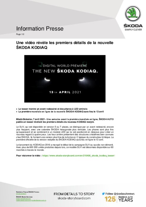 Une semaine avant la première mondiale en ligne, ŠKODA AUTO publie un teaser révélant les premiers détails du nouveau KODIAQ restylé. Le SUV, qui est disponible en version 5 ou 7 places, se distingue par un avant redessiné, encore plus frappant, avec une calandre ŠKODA hexagonale plus verticale. Les phares sont plus fins qu'auparavant et se combinent à un module LED qui lui est positionné en dessous pour créer un nouveau regard à quatre yeux.