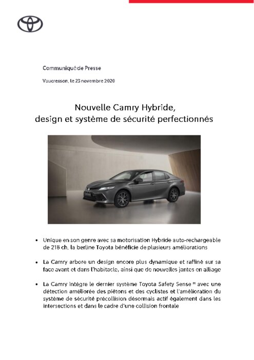 La 8e génération de Toyota Camry, appréciée pour son design, son confort, sa sécurité et sa technologie Hybride auto-rechargeable, bénéficie de nouvelles améliorations qui renforcent son attractivité. La Camry est le fruit de la nouvelle architecture globale de Toyota (TNGA) qui place sur un pied d'égalité le plaisir de conduite et le design, combinés à une qualité de fabrication, une fiabilité et une sécurité de premier ordre.