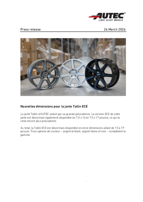Equipementiers 26 mars 2026 - 12:43 La jante Tallin d'AUTEC séduit par sa grande polyvalence. La version ECE de cette jante est désormais également disponible en 7,0 x 16 et 7,5 x 17 pouces, ce qui la rend encore plus polyvalente. PDF (173 Ko) Télécharger credit Autec