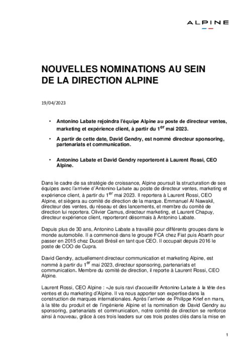 Constructeurs 19 avril 2023 - 10:07 Dans le cadre de sa stratégie de croissance, Alpine poursuit la structuration de ses équipes avec l’arrivée d’Antonino Labate au poste de directeur ventes, marketing et expérience client, à partir du 1er mai . PDF (187 Ko) Télécharger