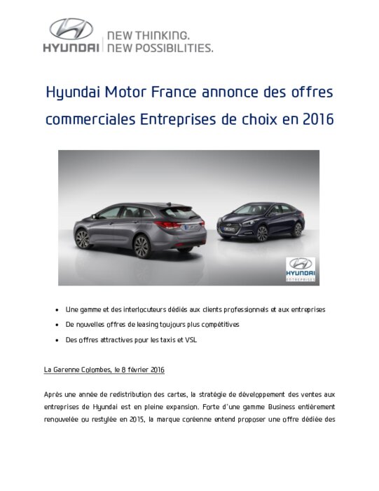 Hyundai propose de nouvelles offres toujours plus attractives et compétitives : Nouveau Tucson 1.7 CRDi 115 ch en finition Creative est à 329€ par mois en Location Longue Durée sur 48 mois et 80 000 km, i30 1.6 CRDi 110 ch Blue Drive Business est à 307€ par mois en Location Longue Durée sur 48 mois et 80 000 km, Nouvelle i40 SW 1.7 CRDi 115ch Business à 350€ par mois en Location Longue Durée sur 48 mois et 80 000 km, maintenance offerte, une offre particulièrement novatrice.