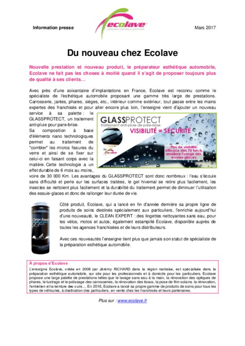 Carrosserie, jantes, phares, sièges, etc., intérieur comme extérieur, tout passe entre les mains expertes des franchisés et pour aller encore plus loin, l’enseigne vient d’ajouter un nouveau service à sa palette : le GLASSPROTECT, un traitement anti-pluie pour pare-brise. Côté produit, Ecolave, qui a lancé en fin d’année dernière sa propre ligne de produits de soins destinés spécialement aux particuliers, l’enrichie d’une nouveauté, le CLEAN EXPERT : des lingettes nettoyantes sans eau.