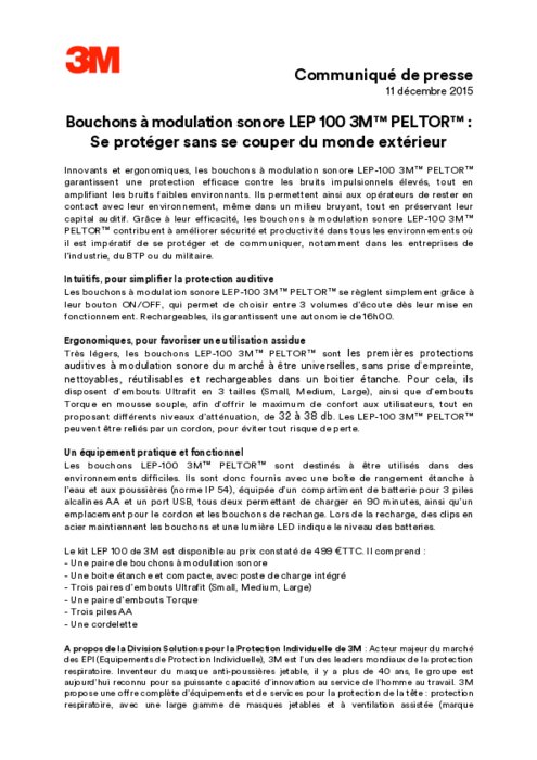 Innovants et ergonomiques, les bouchons à modulation sonore LEP-100 3M PELTOR garantissent une protection efficace contre les bruits impulsionnels élevés, tout en amplifiant les bruits faibles environnants. Ils permettent ainsi aux opérateurs de rester en contact avec leur environnement, même dans un milieu bruyant, tout en préservant leur capital auditif. Grâce à leur efficacité, les bouchons à modulation sonore LEP-100 3 PELTOR contribuent à améliorer sécurité et productivité.