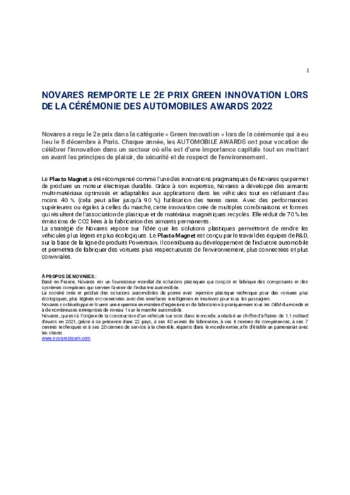 Novares a reçu le 2e prix dans la catégorie « Green Innovation » lors de la cérémonie qui a eu lieu le 8 décembre à Paris. Chaque année, les AUTOMOBILE AWARDS ont pour vocation de célébrer l'innovation dans un secteur où elle est d’une importance capitale tout en mettant en avant les principes de plaisir, de sécurité et de respect de l'environnement.
