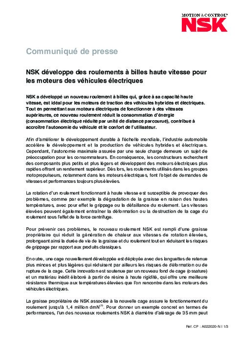 NSK a développé un nouveau roulement à billes qui, grâce à sa capacité haute vitesse, est idéal pour les moteurs de traction des véhicules hybrides et électriques. Tout en permettant aux moteurs électriques de fonctionner à des vitesses supérieures, ce nouveau roulement réduit la consommation d’énergie (consommation électrique réduite par unité de distance parcourue), contribue à accroître l’autonomie du véhicule et le confort de l’utilisateur.