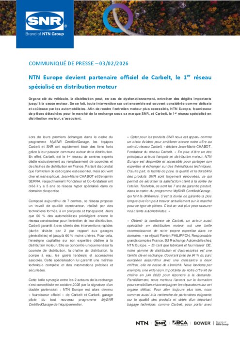 Organe clé du véhicule, la distribution peut, en cas de dysfonctionnement, entraîner des dégâts importants jusqu’à la casse moteur. De ce fait, toute intervention sur cet ensemble est souvent considérée comme délicate et coûteuse par les automobilistes. Afin de rendre l’entretien moteur plus accessible, NTN Europe, fournisseur de pièces détachées pour le marché de la rechange sous sa marque SNR, et Carbelt, le 1er réseau spécialisé en distribution moteur, s’associent.