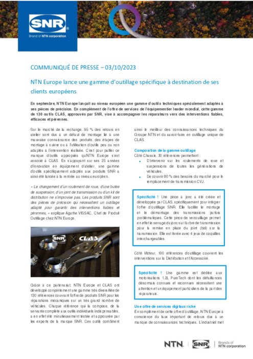 En septembre, NTN Europe lançait au niveau européen une gamme d'outils techniques spécialement adaptés à ses pièces de précision. En complément de l'offre de services de l'équipementier leader mondial, cette gamme de 130 outils CLAS, approuvés par SNR, vise à accompagner les réparateurs vers des interventions fiables, efficaces et pérennes.