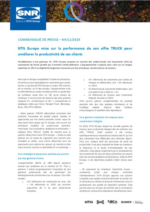 Parallèlement à ses gammes VL, NTN Europe propose au marché des poids-lourds une importante offre de roulements de haute qualité qui s’enrichit continuellement. L’équipementier s’appuie pour cela sur sa longue expertise en OE et sa légitimité largement reconnue par les principaux constructeurs du secteur. Dans cette dynamique, il lançait notamment il y a un an sa nouvelle gamme de moyeux avec roulements intégrés.