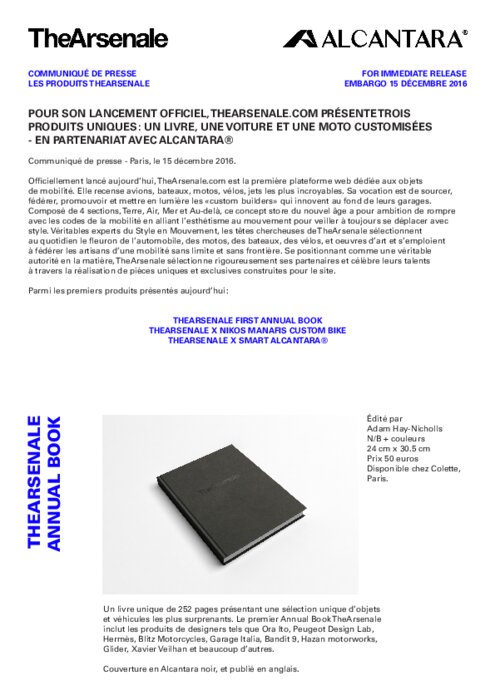 TheArsenale.com est la première plateforme web dédiée aux objets de mobilité. Elle recense avions, bateaux, motos, vélos, jets les plus incroyables. Sa vocation est de sourcer, fédérer, promouvoir et mettre en lumière les "custom builders" qui innovent au fond de leurs garages. Composé de 4 sections, Terre, Air, Mer et Au-delà, ce concept store du nouvel âge a pour ambition de rompre avec les codes de la mobilité en alliant l’esthétisme au mouvement pour veiller à se déplacer avec style.