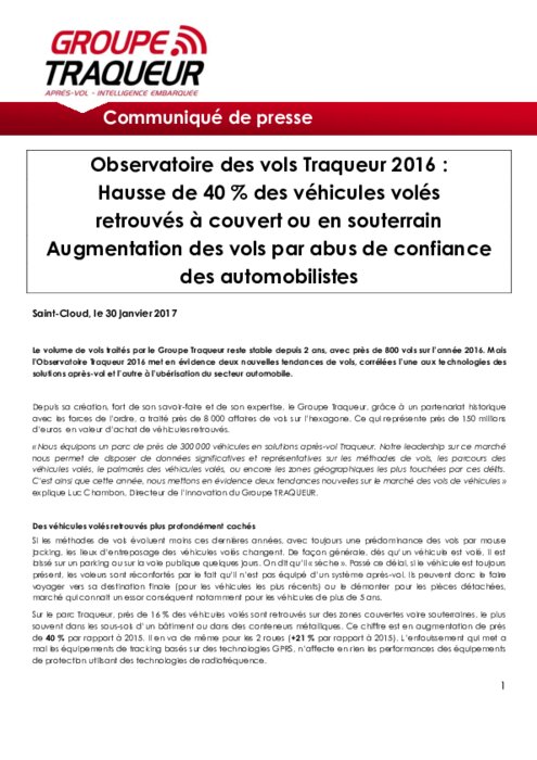 Le volume de vols traités par le Groupe Traqueur reste stable depuis 2 ans, avec près de 800 vols sur l’année 2016. Mais l’Observatoire Traqueur 2016 met en évidence deux nouvelles tendances de vols, corrélées l’une aux technologies des solutions après-vol et l’autre à l’ubérisation du secteur automobile.