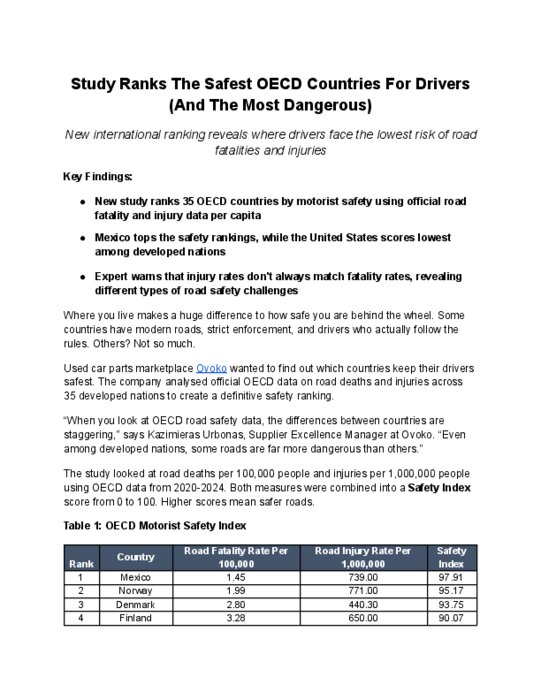 Une nouvelle étude classe 35 pays de l'OCDE en fonction de la sécurité routière, à partir des données officielles sur le nombre de décès et de blessés par habitant. Le Mexique arrive en tête du classement, tandis que les États-Unis obtiennent le score le plus bas parmi les pays développés. Les experts soulignent que les taux de blessures ne correspondent pas toujours aux taux de mortalité, ce qui révèle différents types de défis en matière de sécurité routière.
