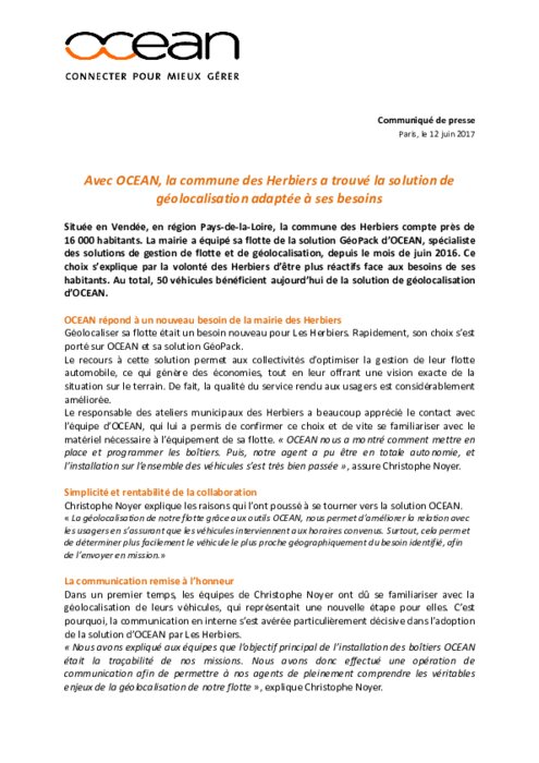 Située en Vendée, en région Pays-de-la-Loire, la commune des Herbiers compte près de 16.000 habitants. La mairie a équipé sa flotte de la solution GéoPack d'OCEAN, spécialiste des solutions de gestion de flotte et de géolocalisation, depuis le mois de juin 2016. Ce choix s'explique par la volonté des Herbiers d'être plus réactifs face aux besoins de ses habitants. Au total, 50 véhicules bénéficient aujourd'hui de la solution de géolocalisation d'OCEAN.