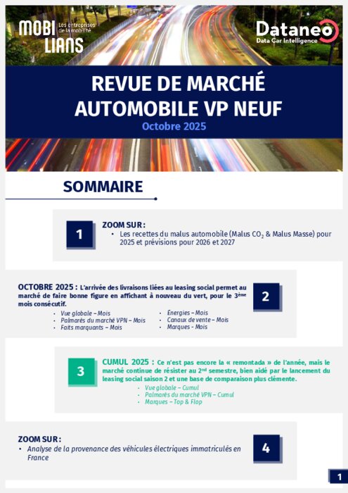 Mobilians publie, en partenariat avec Dataneo, son baromètre mensuel du marché automobile pour ce mois d’octobre 2025. Cet outil, élaboré dans une optique d'analyse approfondie et précise, offre une vision éclairée et actualisée des tendances et évolutions du secteur automobile. Grâce à cette collaboration avec Dataneo, leader dans le domaine de la collecte et de l'analyse de données, MOBILIANS propose un outil essentiel pour mieux appréhender les dynamiques du marché, contribuant ainsi à une vision plus éclairée et informée de l'univers automobile. En ce mois d’octobre, le marché des véhicules particuliers neufs est en hausse avec une progression de +2,9% avec 139 510 immatriculations par rapport à 135 530 unités en octobre 2024.