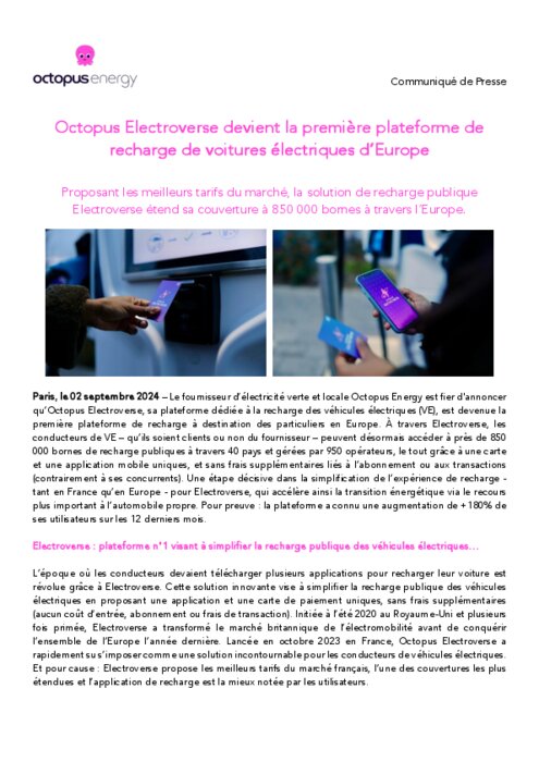 Le fournisseur d’électricité verte et locale Octopus Energy est fier d'annoncer qu’Octopus Electroverse, sa plateforme dédiée à la recharge des véhicules électriques (VE), est devenue la première plateforme de recharge à destination des particuliers en Europe.