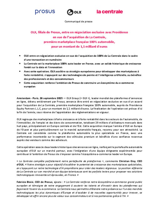 OLX Group (« OLX »), leader mondial des plateformes d’annonces en ligne, détenu entièrement par Prosus, annonce être entré en négociation exclusive en vue d’un accord pour l’acquisition de La Centrale, première marketplace française 100% automobile, auprès de Providence Equity Partners L.L.C, pour un montant de 1,1 milliard d'euros. La finalisation de l’opération est prévue d’ici la fin de l’année, sous réserve de l’approbation des réglementations en vigueur.
