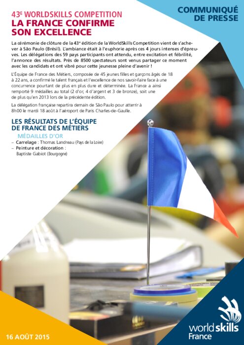 La cérémonie de clôture de la 43e édition de la WorldSkills Competition vient de s’achever à São Paulo (Brésil). L’ambiance était à l’euphorie après ces 4 jours intenses d’épreuves. Les délégations des 59 pays participants ont attendu, entre excitation et fébrilité, l’annonce des résultats. L’Équipe de France des Métiers, composée de 45 jeunes filles et garçons âgés de 18 à 22 ans a ainsi remporté 9 médailles au total (2 d’or, 4 d’argent et 3 de bronze), soit une de plus qu’en 2013.