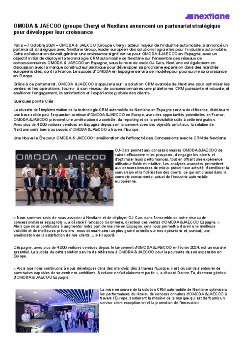 Omoda & Jaecoo (Groupe Chery), acteur majeur de l'industrie automobile, a annoncé un partenariat stratégique avec Nextlane Group, leader européen des solutions logicielles pour l’industrie automobile. Cette collaboration devrait générer une croissance significative pour OMODA &JAECOO en Espagne, avec un objectif initial de déployer la technologie CRM automobile de Nextlane sur l'ensemble des réseaux de concessionnaires OMODA & JAECOO en Espagne, sous le nom de code OJ-Cars.