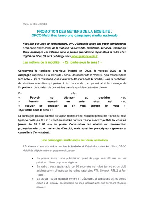Services 18 avril 2023 - 09:30 Face aux pénuries de compétences, OPCO Mobilités lance une vaste campagne de promotion des métiers de la mobilité : automobile, logistique, services, transports. PDF (208 Ko) Télécharger