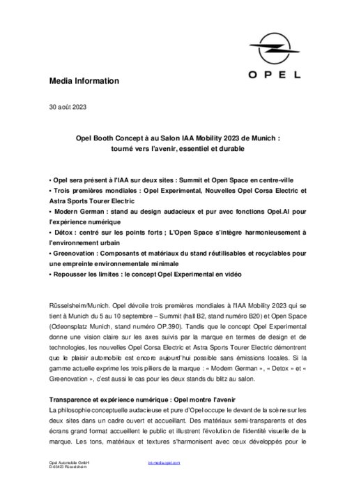 Opel dévoile trois premières mondiales à l'IAA Mobility 2023 qui se tient à Munich du 5 au 10 septembre – Summit (hall B2, stand numéro B20) et Open Space (Odeonsplatz Munich, stand numéro OP.390). Tandis que le concept Opel Experimental donne une vision claire sur les axes suivis par la marque en termes de design et de technologies, les nouvelles Opel Corsa Electric et Astra Sports Tourer Electric démontrent que le plaisir automobile est encore aujourd’hui possible sans émissions locales. Si la gamme actuelle exprime les trois piliers de la marque : «Modern German», «Detox» et «Greenovation», c’est aussi le cas pour les deux stands du blitz au salon.
