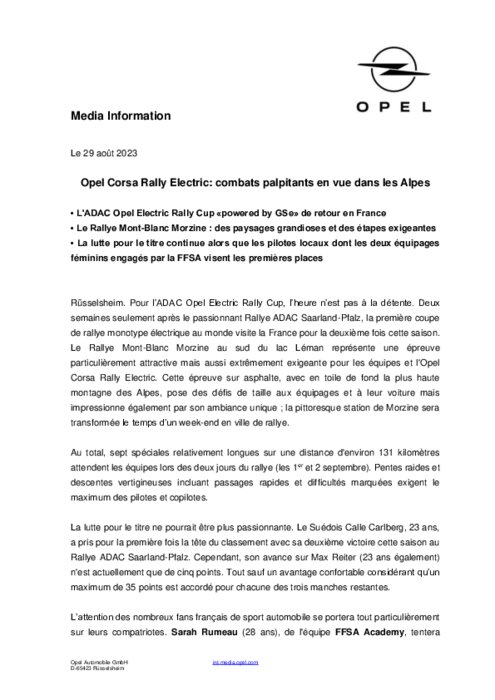 Pour l’ADAC Opel Electric Rally Cup, l’heure n’est pas à la détente. Deux semaines seulement après le passionnant Rallye ADAC Saarland-Pfalz, la première coupe de rallye monotype électrique au monde visite la France pour la deuxième fois cette saison.