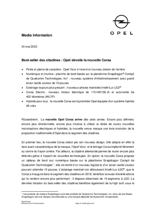 La nouvelle Opel Corsa arrive dès cette année. Encore plus affirmée, encore plus émotionnelle, encore plus intuitive à utiliser et dotée de toutes nouvelles motorisations électriques et hybrides, la nouvelle venue marque une forte évolution de la proposition traditionnelle d’Opel dans le segment des citadines.