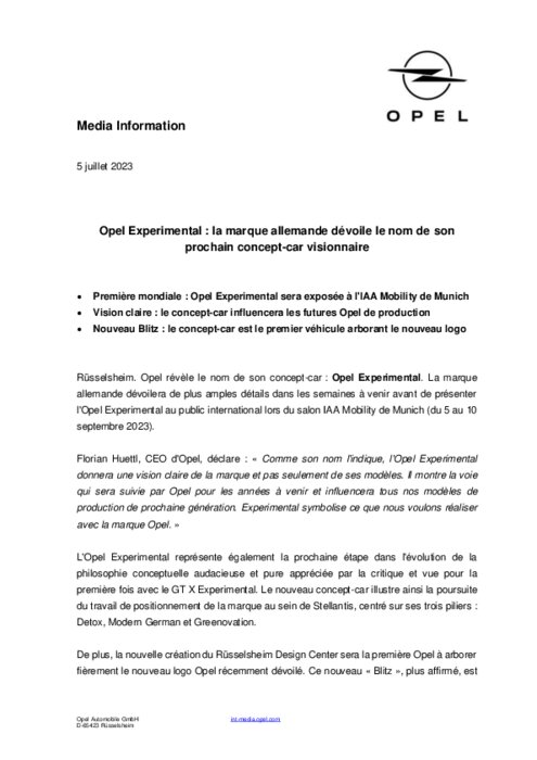 Opel révèle le nom de son concept-car : Opel Experimental. La marque allemande dévoilera de plus amples détails dans les semaines à venir avant de présenter l'Opel Experimental au public international lors du salon IAA Mobility de Munich (du 5 au 10 septembre 2023).