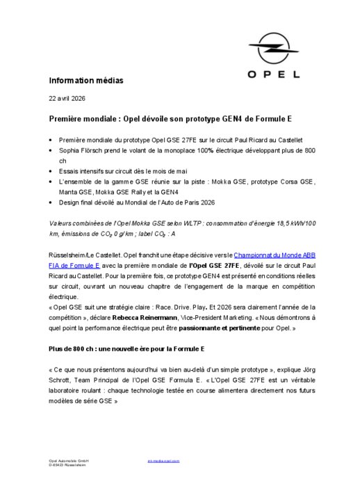 Opel franchit une étape décisive vers le Championnat du Monde ABB FIA de Formule E avec la première mondiale de l’Opel GSE 27FE, dévoilé sur le circuit Paul Ricard au Castellet. Pour la première fois, ce prototype GEN4 est présenté en conditions réelles sur circuit, ouvrant un nouveau chapitre de l’engagement de la marque en compétition électrique.