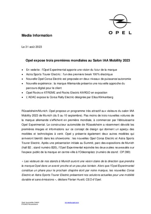 Opel propose un programme très attractif aux visiteurs du salon IAA Mobility 2023 de Munich (du 5 au 10 septembre). Pas moins de trois nouvelles voitures de la marque allemande s’affichent en première mondiale, à commencer par l'éblouissante Opel Experimental. Le constructeur automobile de Rüsselsheim a récemment dévoilé les premières images et informations sur ce concept de design qui donnent un aperçu des modèles et technologies à venir. Opel y présente également deux autres modèles qui arriveront bientôt dans les showrooms : les nouvelles Opel Corsa Electric et Astra Sports Tourer Electric. Après une présentation initiale au Summit, parc des expositions de Munich (hall B2 ; stand numéro B20), l’Opel Experimental rejoindra les deux autres nouveautés sur l’espace public de la marque en centre-ville à l'Odeonsplatz (numéro de stand : OP.390)