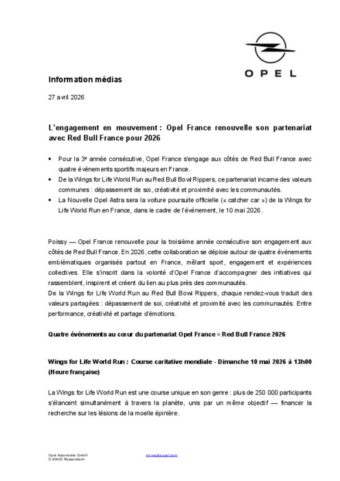 Opel France renouvelle pour la troisième année consécutive son engagement aux côtés de Red Bull France. En 2026, cette collaboration se déploie autour de quatre événements emblématiques organisés partout en France, mêlant sport, engagement et expériences collectives. Elle s’inscrit dans la volonté d’Opel France d’accompagner des initiatives qui rassemblent, inspirent et créent du lien au plus près des communautés.