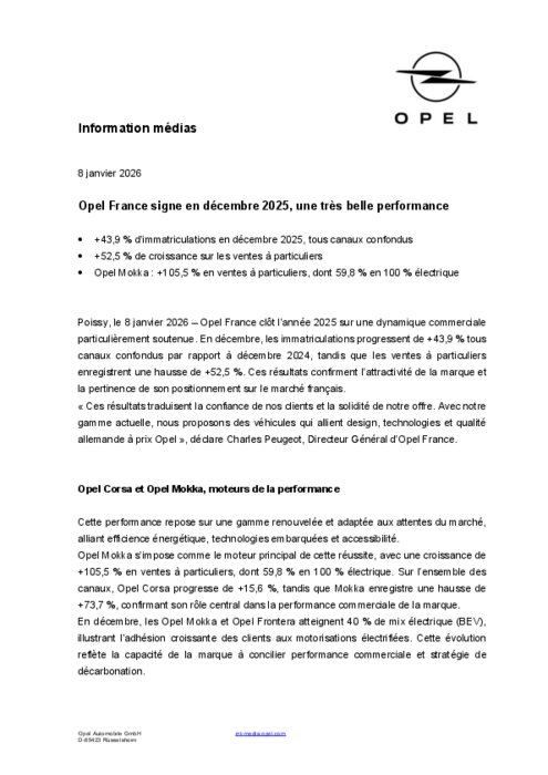 Opel France clôt l’année 2025 sur une dynamique commerciale particulièrement soutenue. En décembre, les immatriculations progressent de +43,9 % tous canaux confondus par rapport à décembre 2024, tandis que les ventes à particuliers enregistrent une hausse de +52,5 %. Ces résultats confirment l’attractivité de la marque et la pertinence de son positionnement sur le marché français.