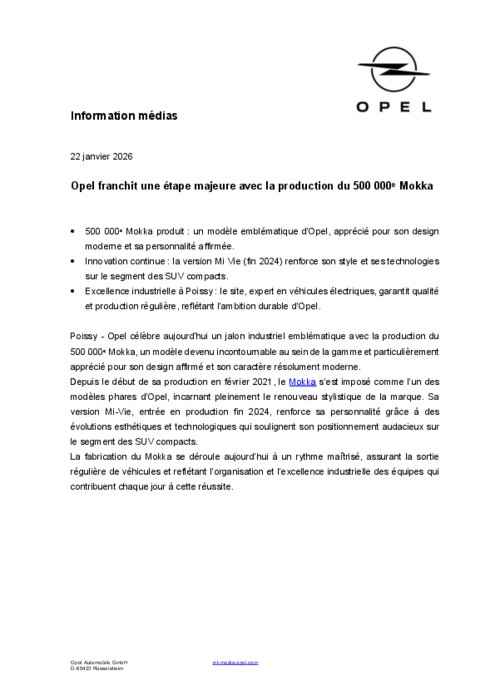 Opel célèbre aujourd’hui un jalon industriel emblématique avec la production du 500 000ᵉ Mokka, un modèle devenu incontournable au sein de la gamme et particulièrement apprécié pour son design affirmé et son caractère résolument moderne. Depuis le début de sa production en février 2021, le Mokka s’est imposé comme l’un des modèles phares d’Opel, incarnant pleinement le renouveau stylistique de la marque. Sa version Mi‑Vie, entrée en production fin 2024, renforce sa personnalité grâce à des évolutions esthétiques et technologiques qui soulignent son positionnement audacieux sur le segment des SUV compacts.