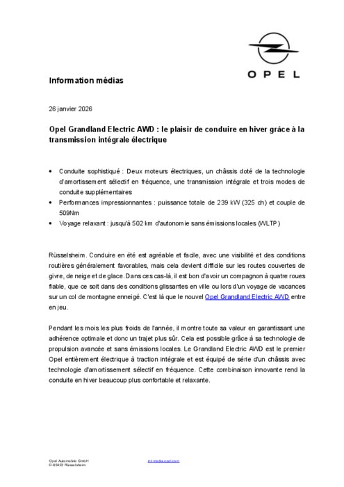 Conduire en été est agréable et facile, avec une visibilité et des conditions routières généralement favorables, mais cela devient difficile sur les routes couvertes de givre, de neige et de glace. Dans ces cas-là, il est bon d'avoir un compagnon à quatre roues fiable, que ce soit dans des conditions glissantes en ville ou lors d'un voyage de vacances sur un col de montagne enneigé. C'est là que le nouvel Opel Grandland Electric AWD entre en jeu.