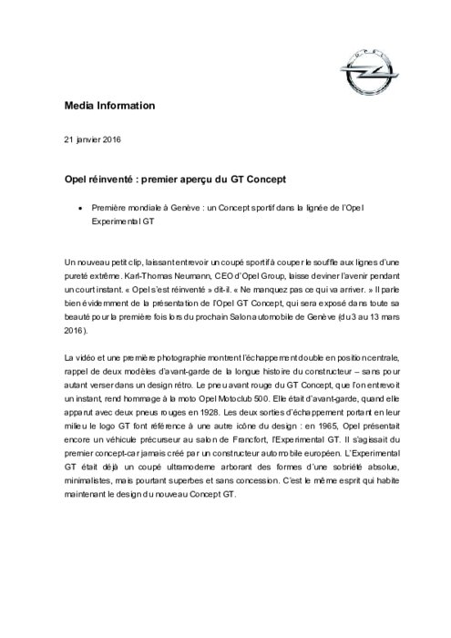 Un nouveau petit clip, laissant entrevoir un coupé sportif à couper le souffle aux lignes d’une pureté extrême. Karl-Thomas Neumann, CEO d’Opel Group, laisse deviner l’avenir pendant un court instant. « Opel s’est réinventé » dit-il. « Ne manquez pas ce qui va arriver. » Il parle bien évidemment de la présentation de l’Opel GT Concept, qui sera exposé dans toute sa beauté pour la première fois lors du prochain Salon automobile de Genève (du 3 au 13 mars 2016).