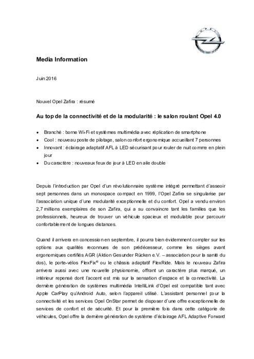 Depuis l’introduction par Opel d’un révolutionnaire système intégré permettant d’asseoir sept personnes dans un monospace compact en 1999, l’Opel Zafira se singularise par l’association unique d’une modularité exceptionnelle et du confort. Opel a vendu environ 2,7 millions exemplaires de son Zafira, qui a su convaincre tant les familles que les professionnels, heureux de trouver un véhicule spacieux et modulable pour parcourir confortablement de longues distances.