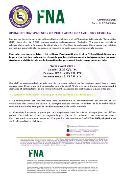 Lancée par l’association « 40 millions d’automobilistes » et la Fédération Nationale de l’Automobile (FNA) dans plus de 2 500 stations-services indépendantes, l’Opération Transparence consiste à afficher clairement, à la caisse, le détail du prix d’un litre de carburant. Cette démarche, inédite, permet aux automobilistes de mieux comprendre ce qu’ils paient réellement à la pompe.