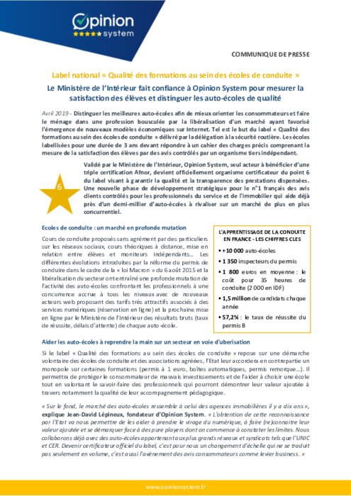 Validé par le Ministère de l'Intérieur, Opinion System, seul acteur à bénéficier d'une triple certification Afnor, devient officiellement organisme certificateur du point 6 du label visant à garantir la qualité et la transparence des prestations dispensées. Une nouvelle phase de développement stratégique pour le n°1 français des avis clients contrôlés pour les pros du service et de l'immobilier qui aide déjà près d'un demi-millier d'auto-écoles à rivaliser sur le marché.