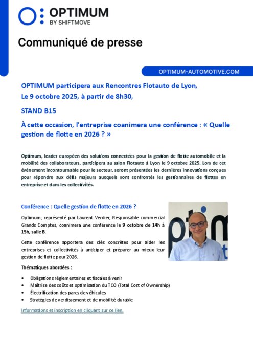 Optimum, leader européen des solutions connectées pour la gestion de flotte automobile et la mobilité des collaborateurs, participera au salon Flotauto à Lyon le 9 octobre 2025. Lors de cet événement incontournable pour le secteur, seront présentées les dernières innovations conçues pour répondre aux défis majeurs auxquels sont confrontés les gestionnaires de flottes en entreprise et dans les collectivités